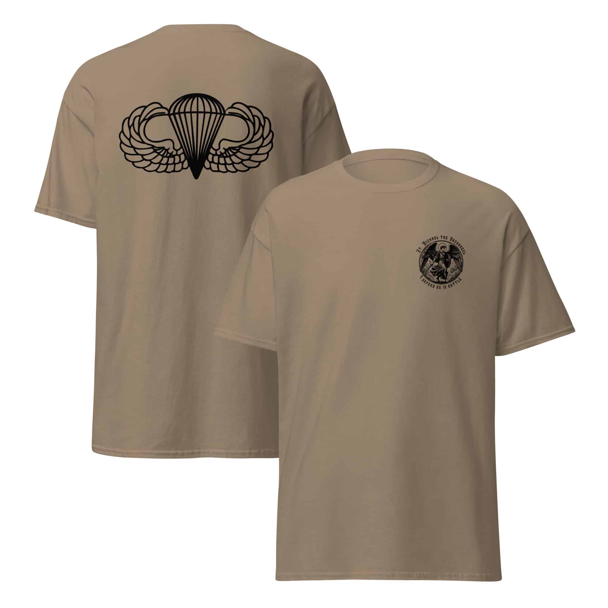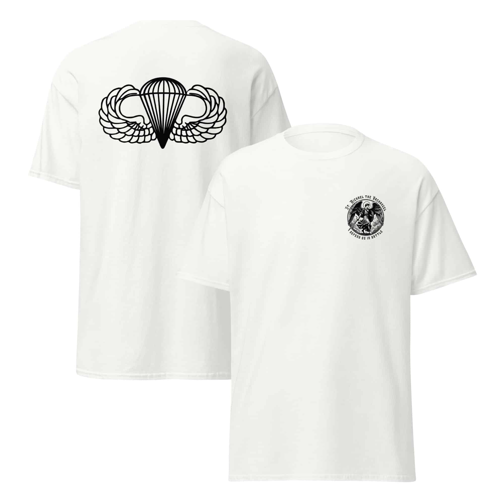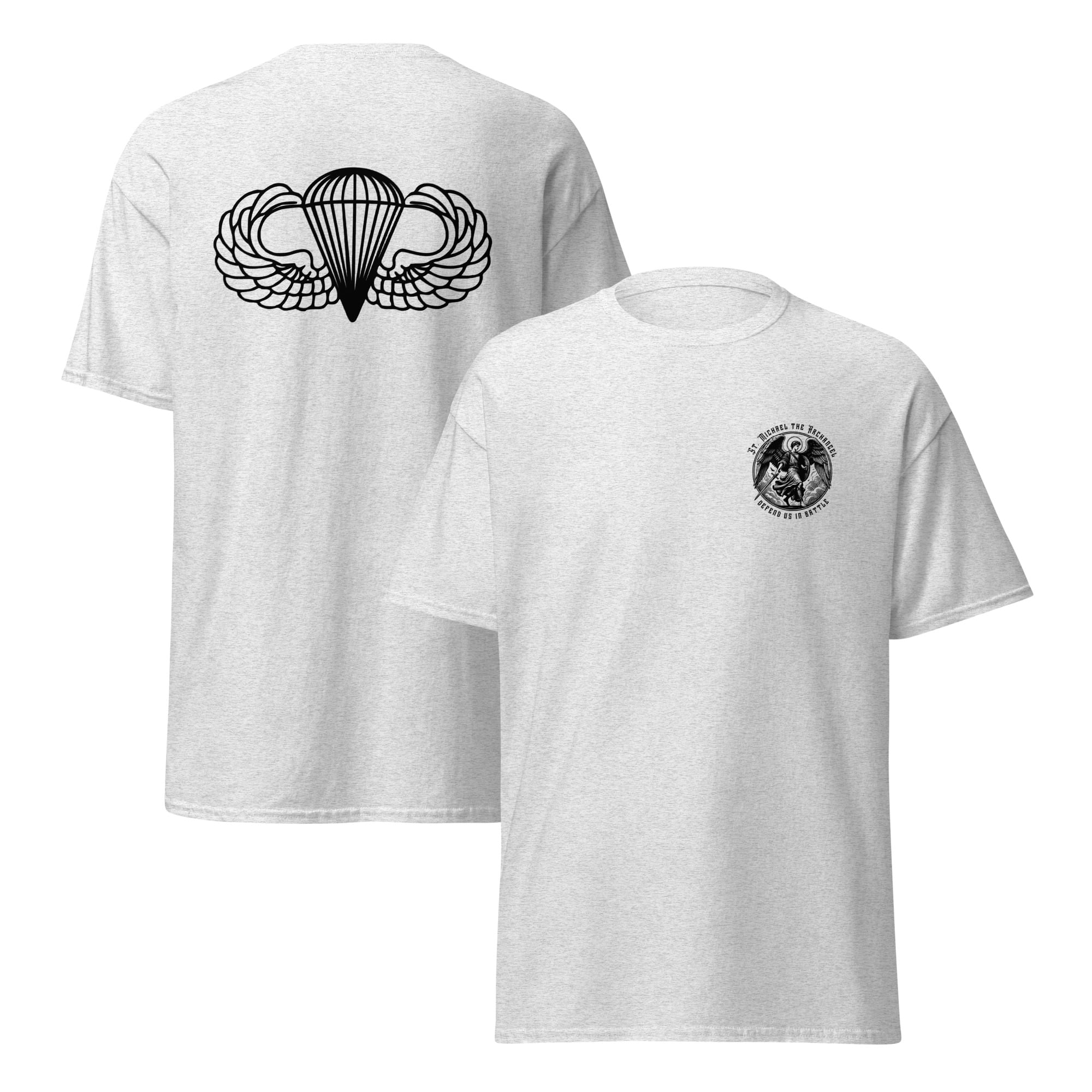 Show your pride in airborne heritage with this St. Michael the Patron Saint of Paratroopers T-Shirt. Inspired by WWII airborne tradition, this shirt features the Archangel Michael—the warrior saint who defends soldiers in battle—standing guard over parachutes and wings. Crafted from soft, durable cotton with a vintage-style print, it’s perfect for veterans, paratroopers, military families, and history enthusiasts alike.